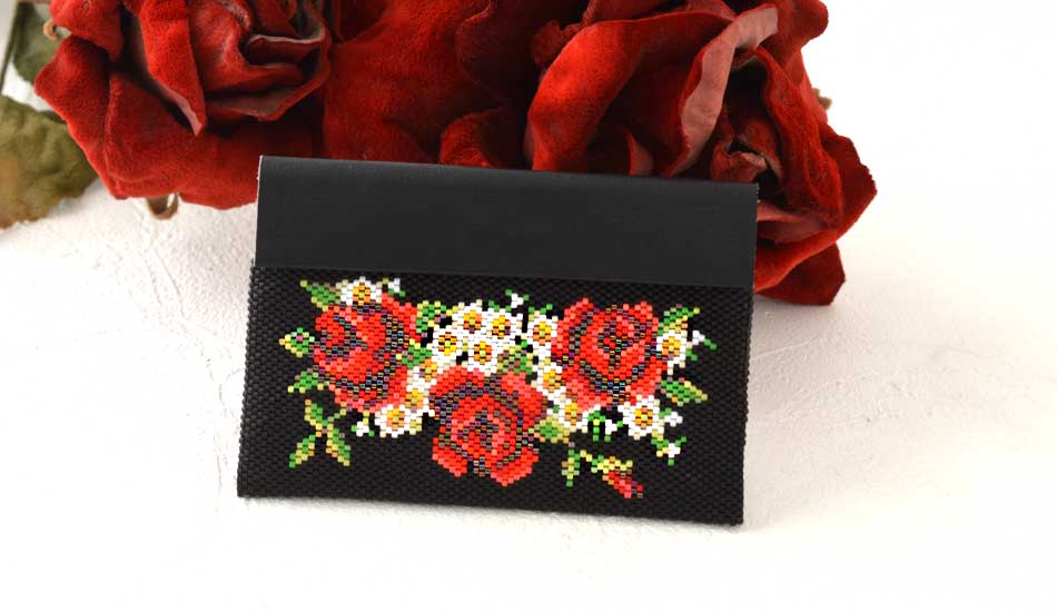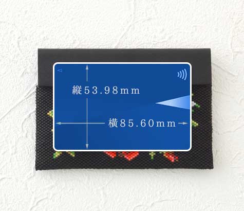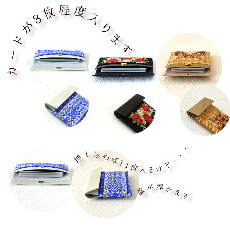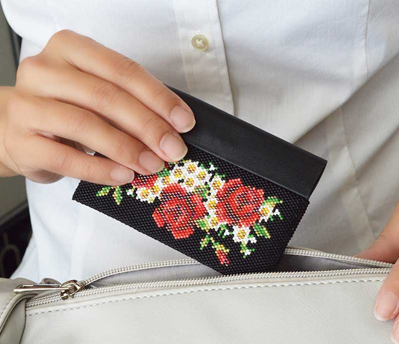 しっとりとした落ち着きのある花模様、薔薇とマーガレットをビーズでデザインしました。ベースカラーを甘すぎない黒で引きしめ、刺しゅう模様にも似た花柄が上品でフェミニンな印象です。ケースの向きが横型なので、カードの向きを変えずに収納できます。