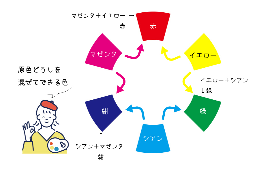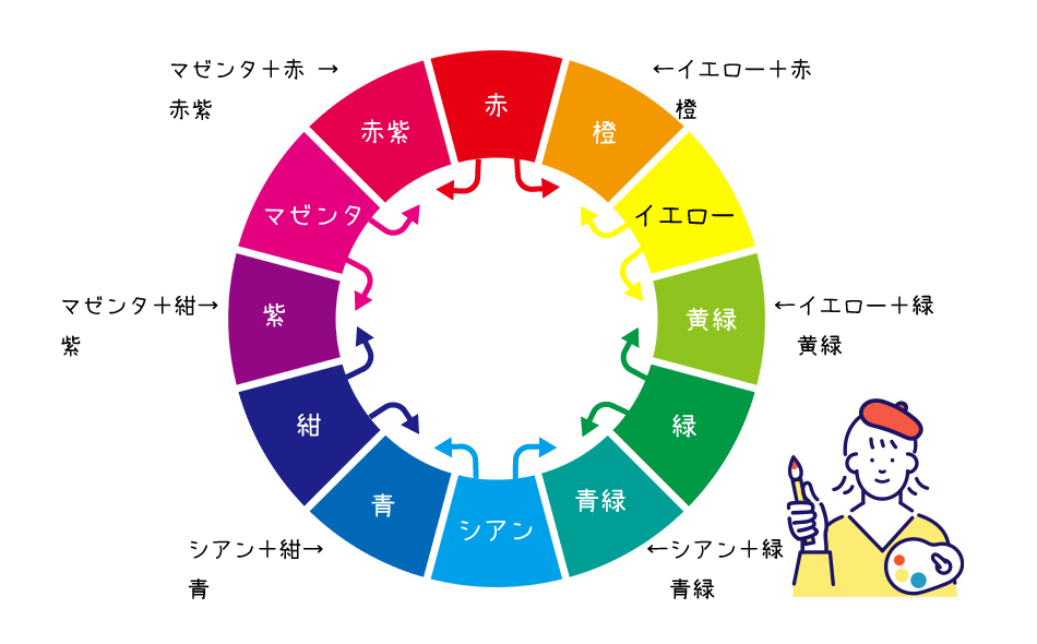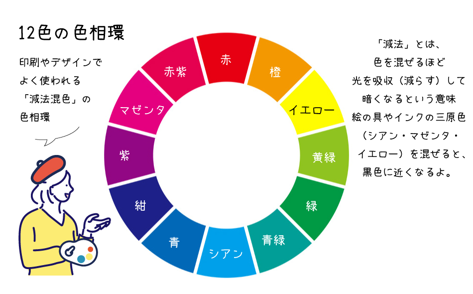 色相環(しきそうかん)は、色相(色みの種類)を環状に並べた図です。