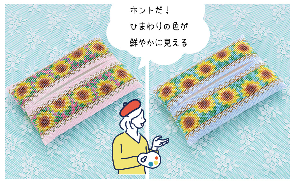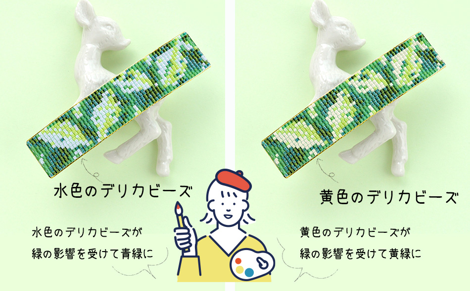 この影響を大きく受けるのが、デリカビーズ織りやビーズステッチです。イメージ通りの色味でも、実際にシートに仕上げると、イメージと違うということがありませんか?それは、周囲のビーズの影響で、色が変化して見えることが原因かもしれません。
