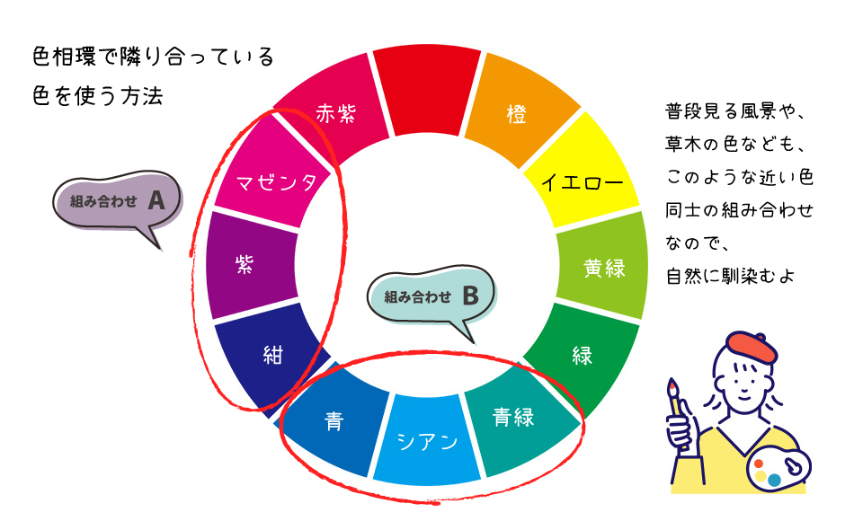 色同士が自然に馴染む方法として、色相環で隣り合っている色を使う方法です。例えば、青、青緑、緑のように、色が近いもの同士の組み合わせです。