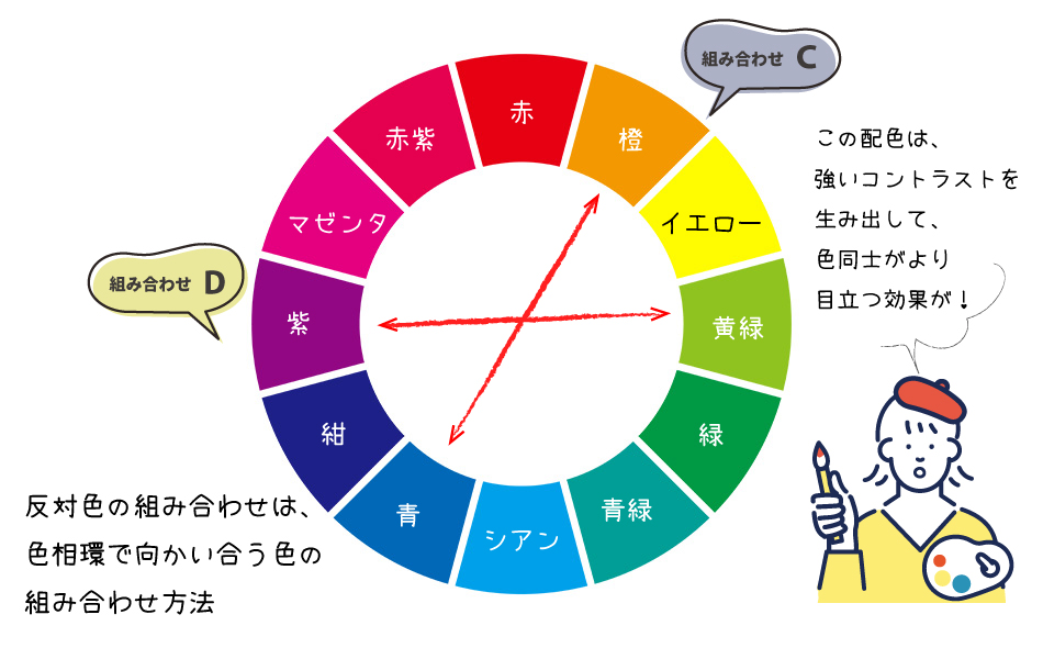 反対色の組み合わせは、色相環で向かい合う色を使う方法です。このような色の組み合わせは「補色」と呼ばれます。補色は、色を混ぜると黒を作り出せるため、すべての色をバランスよく使いながら、お互いの色を補い合う関係にあります。例えば、赤と緑、青とオレンジのように、対照的な色を組み合わせます。