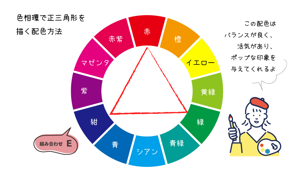 色相環で正三角形を描くように、3つの色を組み合わせる方法です。例えば、赤、青、黄緑のように、色相環で均等に離れた3色を使います。