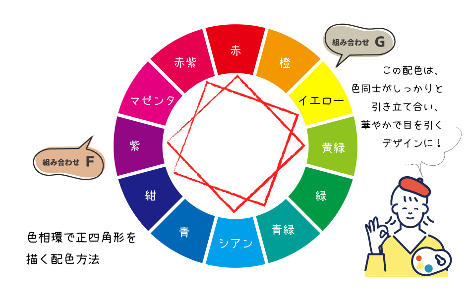 色相環で四角形を描くように、4つの色を組み合わせる方法です。色相環上でバランスよく離れた4色を使うことで、カラフルで個性的な印象を作り出します。