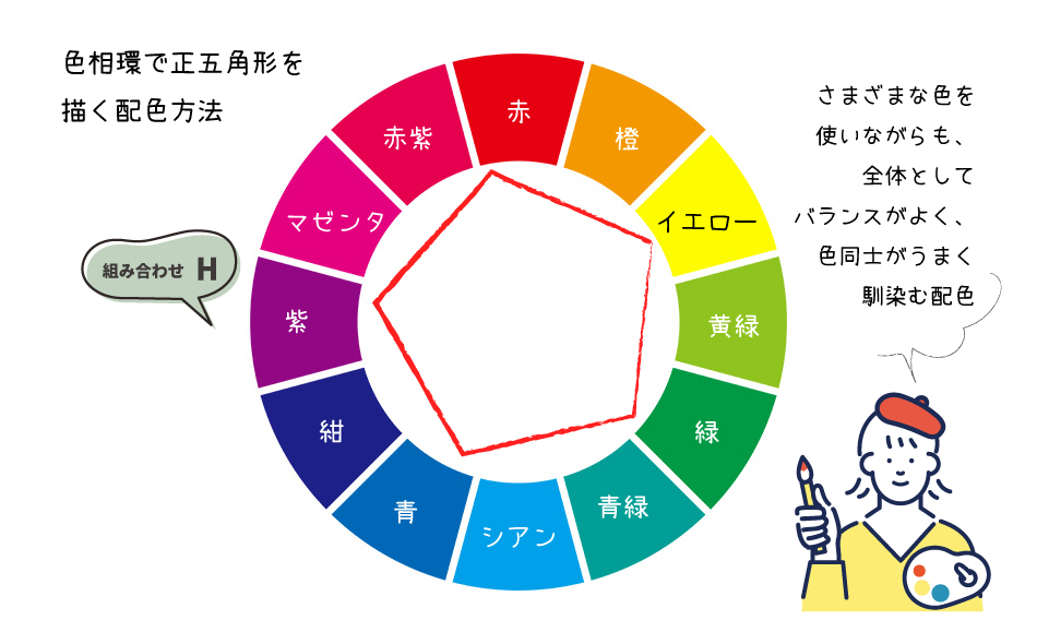 色相環で五角形を描くように、5つの色を組み合わせる方法です。色相環上で均等に離れた5色を使うことで、多色使いでも調和が取れやすくなります。