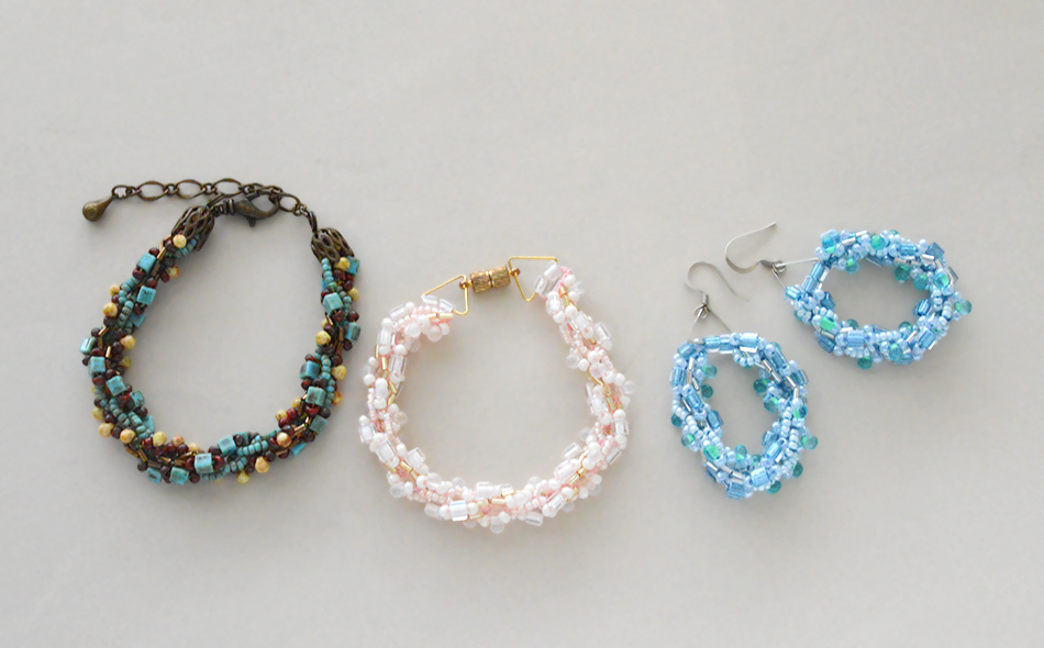 上の作品は、色相環で五角形を描く配色を取り入れたネックレスのレシピをアレンジし、仕上げたブレスレットとピアスです。さらに、色相環で正三角形になる配色や、隣り合う色を組み合わせた配色を使用しています。