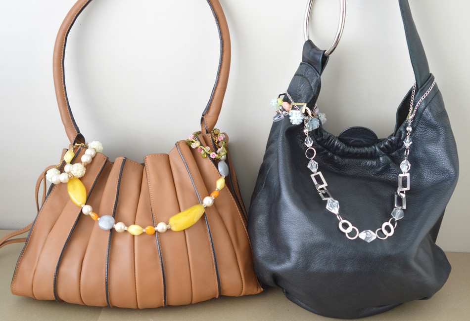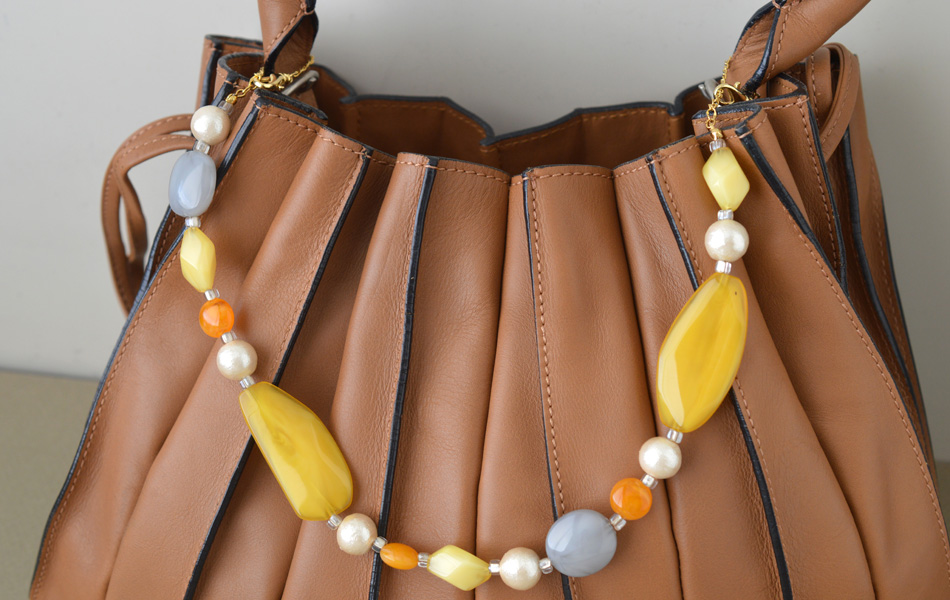 デザインネックレスをアレンジする場合は、チェーン部分をバッグの持ち手のサイズに合わせて短くし、両端をカニカンに変更すると持ち手部分にも簡単に取り付けることができます。