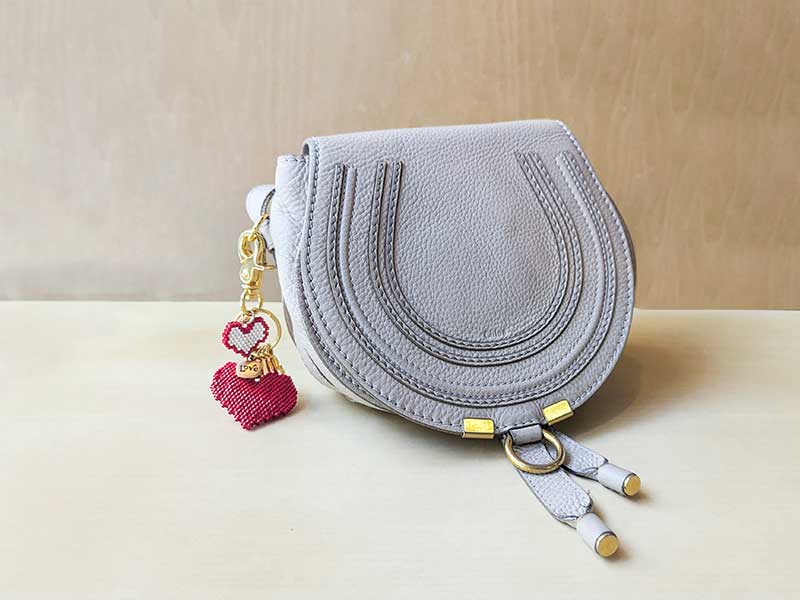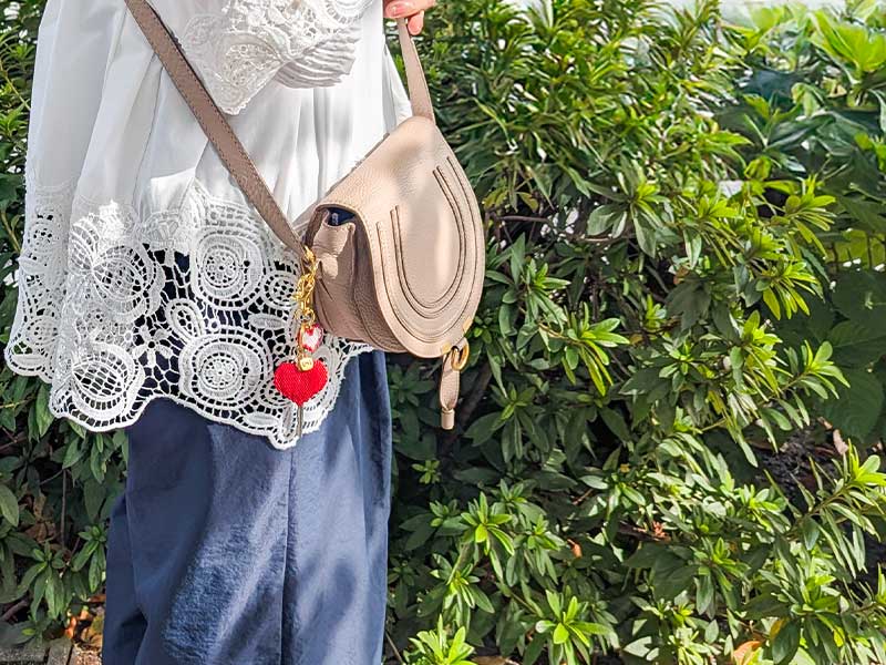 赤のハートはバッグの中でもパッと目を引くアクセントカラー。