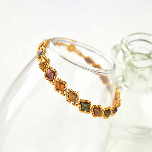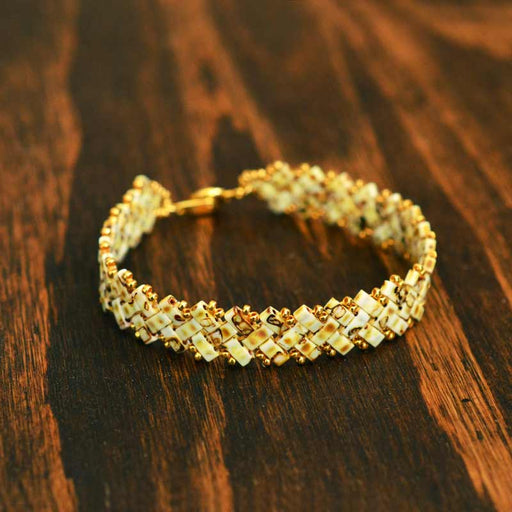 ピカソコーティングされたハーフティラビーズを使った、個性的な格子ブレスのご紹介です。格子が連なるデザインに仕上げています。ピカソカラーにプレシャスビーズを加え、高級感up!手首にしっとりとなじむ軽い着け心地も、ぜひ体験してみて下さいね。特集ページはこちら