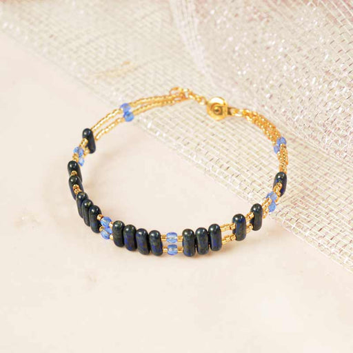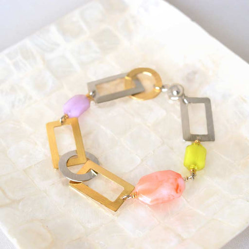 異なる4色のビーズを組み合わせた、リゾート感のあるブレスレットのご紹介です。ハーフティラビーズと丸小ビーズでユニークなシルエットに仕上げています。少し幅広のリゾート感のあるブレスレットは、これからの季節に大活躍です。