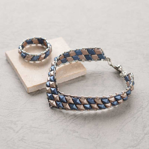 ビーズ男子のための、〜字ブレスとリングです。ダイヤモンデュオビーズでかっこよく〜字に仕上げました。女性用には、両サイドを1〜2段小さくしてみてください。
