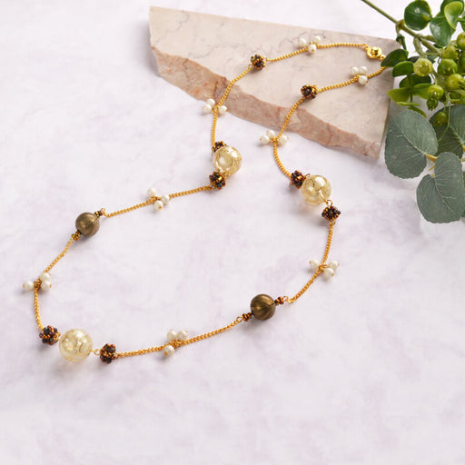 艶やかなデカールビーズを主役に、アンティーク調のカラーでまとめたネックレスです。アクセントにベリービーズで作ったビーズボールを引き締めカラーに入れた、大人のカジュアルにピッタリなアクセサリーをお楽しみください。特集ページはこちら