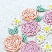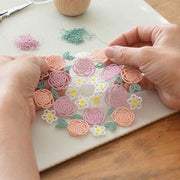 くすみカラーで作った、落ち着いてるのに、ふんわりかわいいバラのドイリー。葉っぱも同様にくすみカラーで仕上げました。花びらの大きさを変えるため、1周のビーズの数が違うところがあるのでご注意ください。