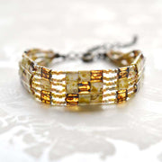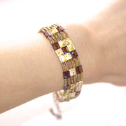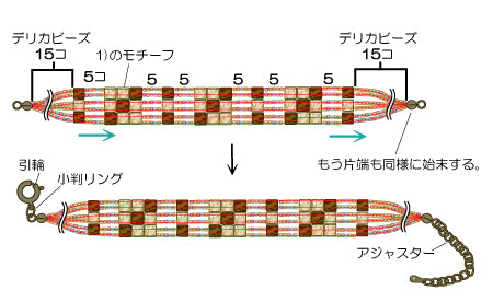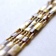 MIYUKIの新しいビーズ【ピカソコーティングビーズ】が新発売!ピカソコーティングされたティラビーズ2色を組み合わせたプレートが印象的なブレスレットです。少し、べっ甲にも似た色味のビーズで、高級感もプラスされた優しい色合い。ブレスレットはモノコードで出来ているので、手首に馴染みやすく、しっとりした着け心地ですよ。