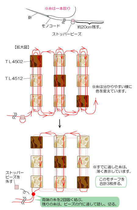 ティラビーズを横から見て少し膨らんだ面を上にしてモチーフを編むと、綺麗な形に編めます。