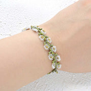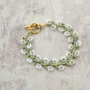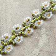 可愛らしい小花が連なったボタニカルチェーンのブレスレット。味わいのあるピカソコーティングビーズとナチュラルなボタニカルデザインが相性良く、肌馴染みもいいですよ。ビーズステッチの繰り返し編みで楽しく作れます。