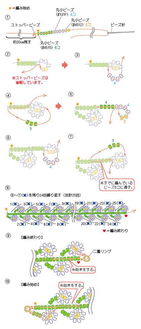適度に糸を引き締めながら編み進めてください。同じビーズに針を通すときは、先に通した糸を割ると上手く糸が引き締まらないことがあるので、注意しましょう。