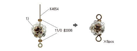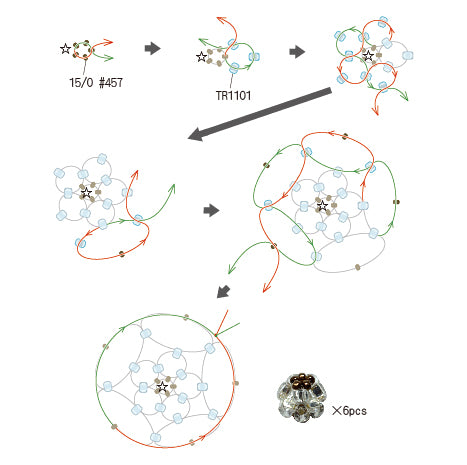 図の中のテグスは分かりやすいようにゆるめて描いてありますが、実際は適度に引きしめながら作りましょう。テグスがビーズに通しにくい場合は、テグスの先を斜めにカットすると通しやすくなります。