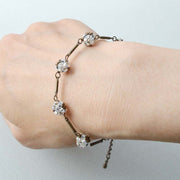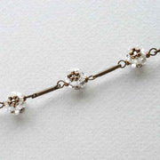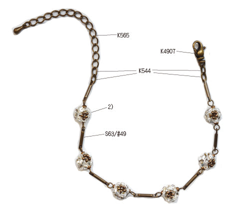 トライアングルビーズと丸特小ビーズで作るビーズボールと、メノーニ社メタルパーツを組み合わせたブレスレットです。チェーンのようなしなやかな着け心地で、とても肌馴染みが良いですよ。