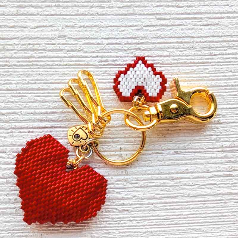ハート小を編む際には配色に気を付け、はぎ合わせの際には2枚をしっかり合わせ、拾うビーズを間違えないよう注意してください。
