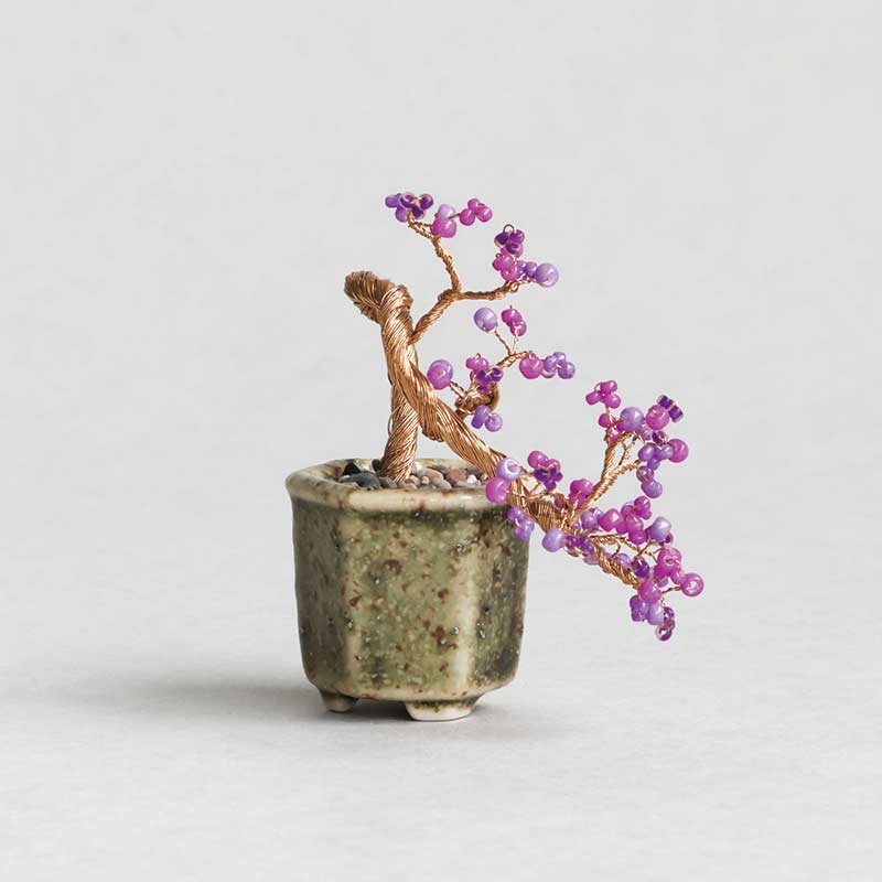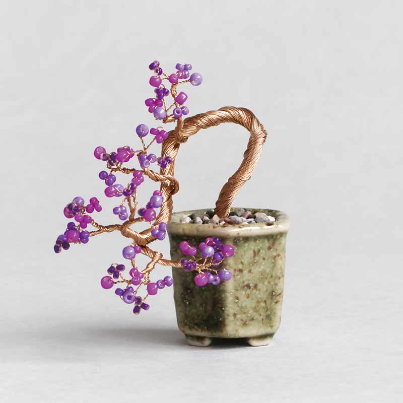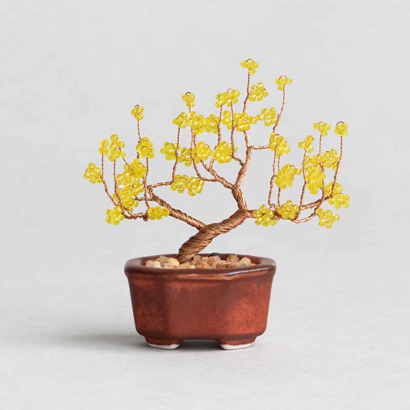 ワイヤーでつくる小さな盆栽のキット。枝や葉を自在に動かせるので、本物の盆栽のように好みの樹形に仕立てることができます。作り方は、カットしたワイヤーにビーズを通してねじるだけ。工具不要で、はさみとものさしだけあれば作ることができます。ねじることによるワイヤーの動きが、まるで本物の幹のよう。指先でつまめる小さなサイズで、ずらりと並べて飾るのもおすすめです。