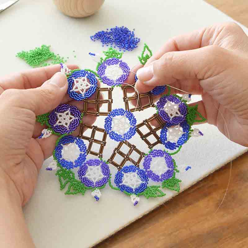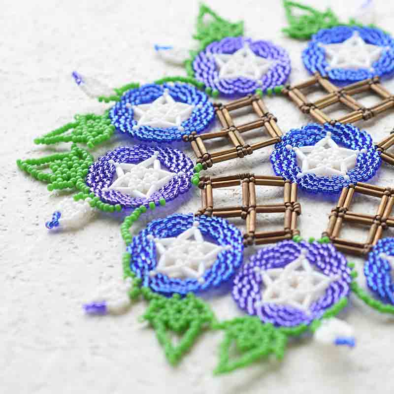 夏休みの自由研究を思い出すあさがお!いろんな色のあさがおがありますが、今回は紫と青のあさがおでドイリーを作りました。垣根にはうあさがお、懐かしい子供時代を思い出して・・・