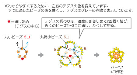 テグスを30cm×4本に切り、丸小ビーズと丸特小ビーズを通し編み、パーツAを4コ作る。