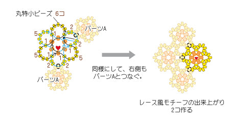 テグスを30cm×4本に切り、モチーフを作りながらパーツAをつなぎ、レース風モチーフを2コ作る。