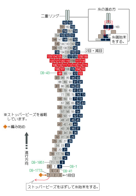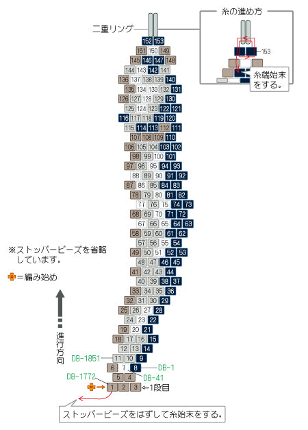 糸を強く引きすぎたり、同じビーズに何度も針を通すと、ビーズが割れることがありますので、ご注意ください。分かりやすくするために、イラストでは糸の色を変えています。
