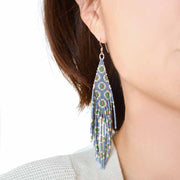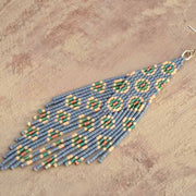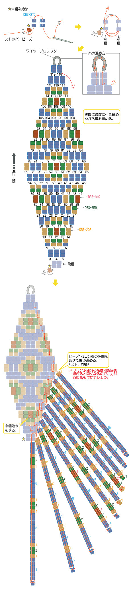 カットの美しいデリカビーズS(DBS 15/0)で作る、繊細なラインが揺れて華やかなビーズフリンジアクセサリーです。花をドット模様にした、大人かわいいデザインに仕立てました。少しボリュームがほしい時には、デリカビーズ(DB 11/0)で作るのもおすすめです。