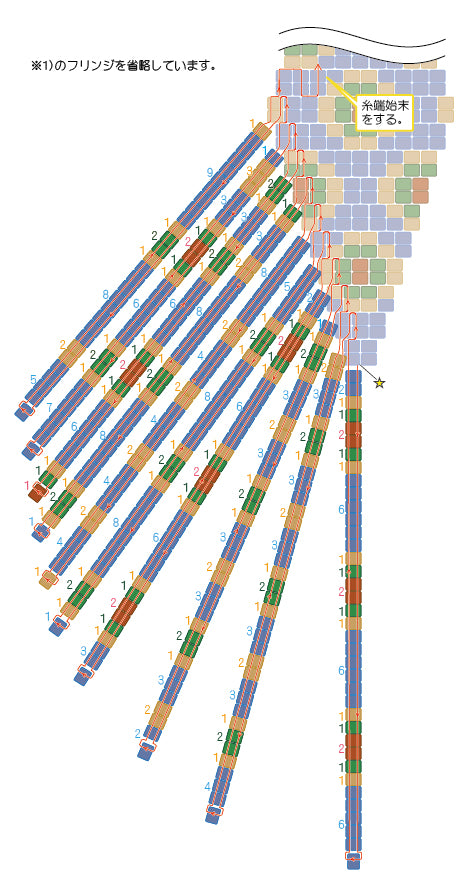 ワイヤープロテクターをつなぎ、そのままフリンジ半分を編みつけて、編み終わりの糸端を始末する。