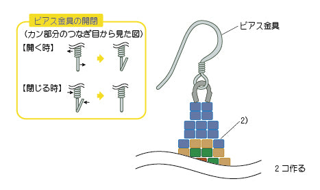 ピアス金具のカンに2)を通しつけて出来上がり。