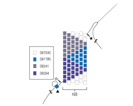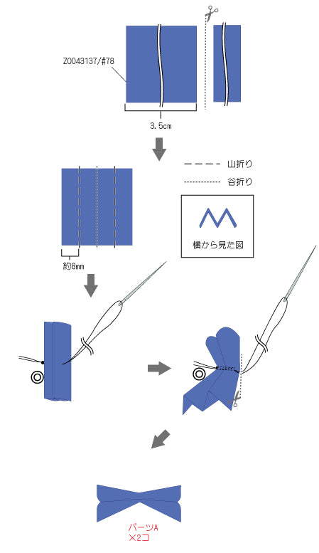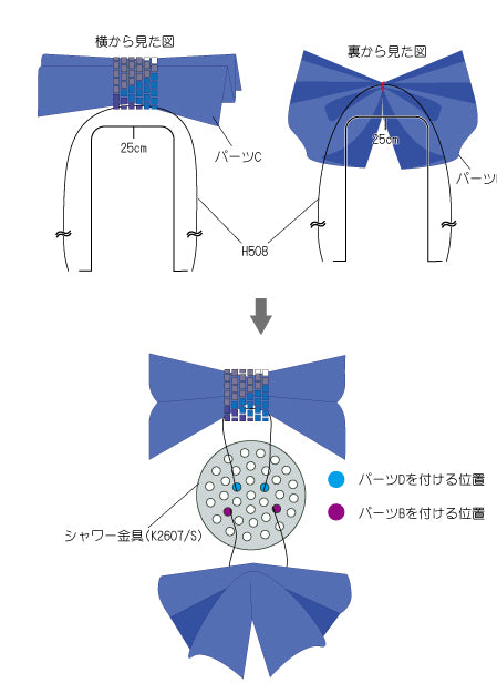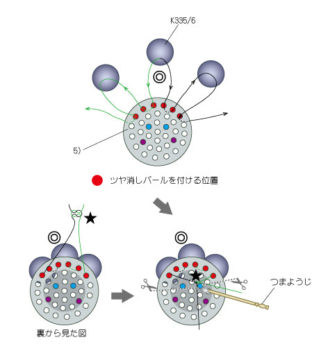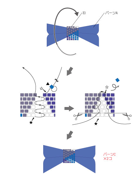 グログランリボンの両端をライターで軽くあぶるとほつれ難くなります。また、ステッチをする際、糸を強く引きすぎたり、同じビーズに何度も糸を通すと、ビーズが割れることがありますので、ご注意ください。分かりやすくするために、イラストでは糸やテグスの色を変えています。パールにテグスが通し辛い時は、目打ち棒等で穴を少し大きくすると、通し易くなります。