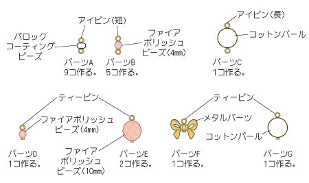 アイピン・ティーピンにコットンパール・ビーズ・メタルパーツを通してピン曲げをし、パーツA〜Gを作る。