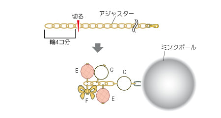 アジャスターを4コマ(輪)に切り、各パーツ・ミンクボールをつなぐ。