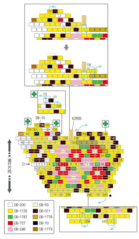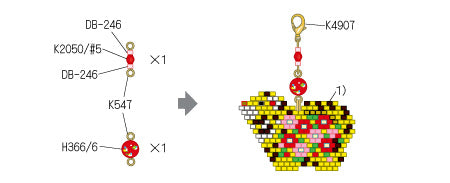 糸を強く引きすぎたり、同じビーズに何度も針を通すと、ビーズが割れることがありますので、ご注意ください。分かりやすくするために、イラストでは糸の色を変えています。