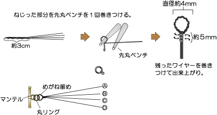 ワイヤーを1.2m×4本に切り、まとめて端を3cm程ねじり、めがね留めを作り、丸リングで マンテルをつける。