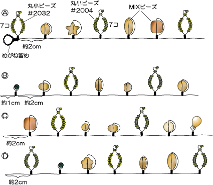 図の様に4本のワイヤーそれぞれにビーズをねじりながら留めつけ45cm〜50cm(お好みの長さ