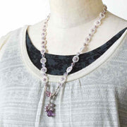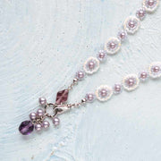 基本のデージーステッチにひと手間加えたネックレスのご紹介です。薄紫のデリカビーズでデージーステッチした上に、間隔をあけてクリーム色のビーズを一周加え、リズム感のある首周り部分が完成。同系色のビーズ・パールでネックレストップを作り、品良くまとめています。