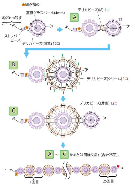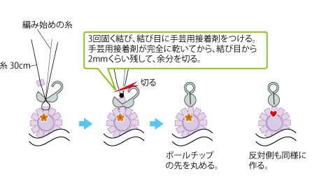 糸を強く引きすぎたり、同じビーズに何度も針を通すと、ビーズが割れることがありますので、ご注意ください。