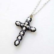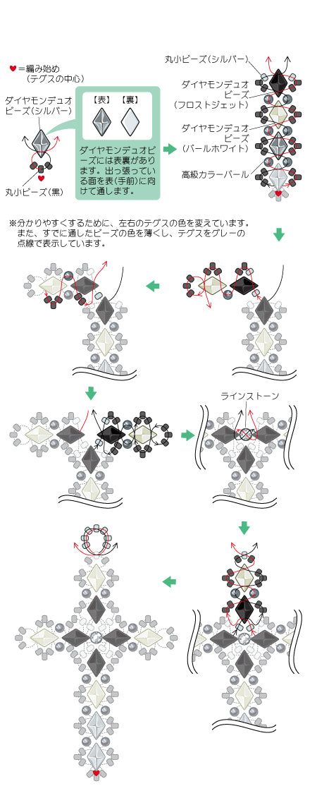 ダイヤモンデュオで立体的なリバーシブルクロスを作ってみました。中心のチャームを作ったら、チェーンにつなぐだけで出来るシンプルデザイン。表面と裏面で表情が変わるのも素敵ですね。