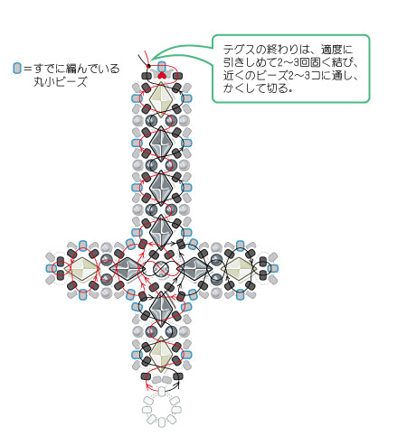 図の中のテグスは分かりやすいようにゆるめて書いてありますが、実際は適度に引きしめながら作りましょう。