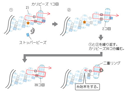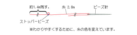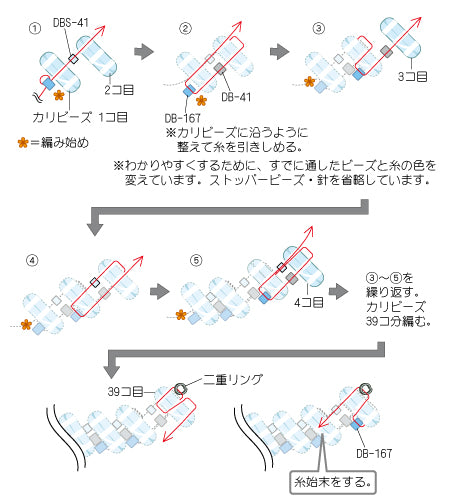 ビーズを通す際、デリカビーズとデリカビーズSを間違えないように気をつけてください。糸の引きしめ具合により、出来上がりサイズが多少変わります。糸始末前に長さをはかり、お好みの長さを確認してから作業してください。