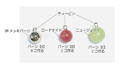 ティーピンに天然石・パーツを通して、ピン曲げし、パーツ【A】〜【C】を作る。