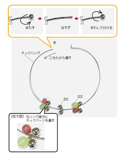 ネックリングの端に付いている玉を外し、パーツ【D】・【E】を通し、外した玉を付けて、出来上がり。