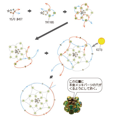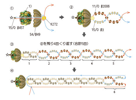 図の中のテグスは分かりやすいようにゆるめて描いてありますが、実際は適度に引きしめながら作りましょう。テグスがビーズに通しにくい場合は、テグスの先を斜めにカットすると通しやすくなります。