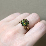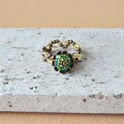 繊細な模様が施されたメノーニ社の花型メタルパーツとビーズボールを組み合わせたフラワービーズリング。着け心地が軽く、アンティーク調なデザインを楽しめます。好きな色のビーズでアレンジカラーもお楽しみください。