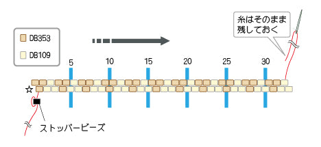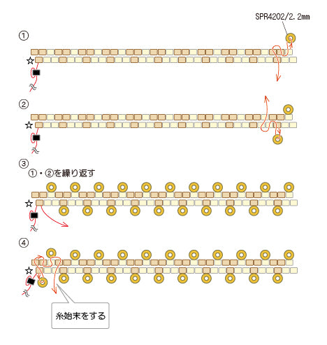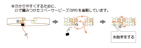 糸を強く引きすぎたり、同じビーズに何度も針を通すと、ビーズが割れることがありますので、ご注意ください。