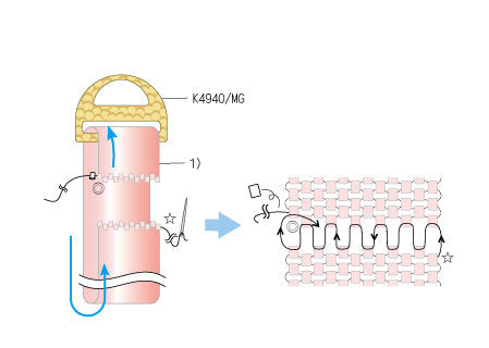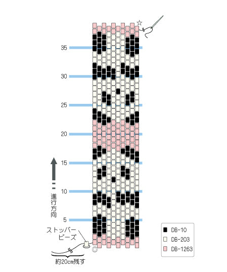 糸を強く引きすぎたり、同じビーズに何度も針を通すと、ビーズが割れることがありますので、ご注意ください。分かりやすくするために、イラストでは糸の色を変えています。