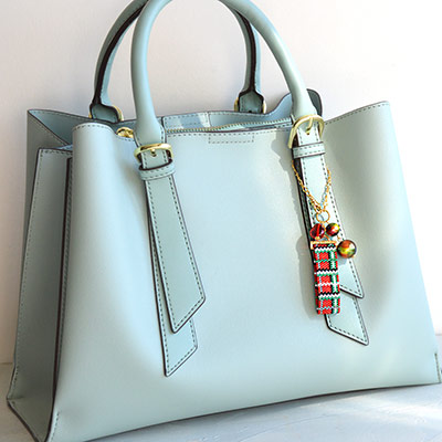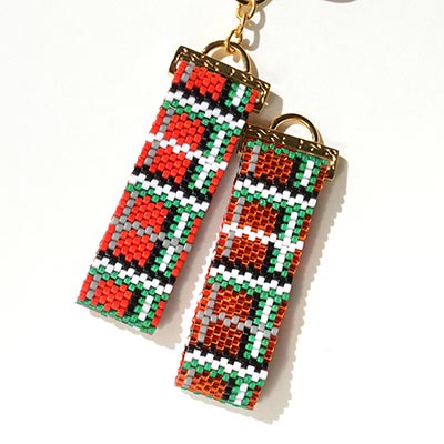 クリスマスカラーがキュートなタータンチェック柄のバッグチャームのご紹介です。デリカビーズのシートは、ペヨーテステッチの技法で編んでいます。チェック柄が可愛いチェッカーパールとツヤツヤの変形トライアングルビーズを添えて、大人可愛い仕上がりになっています。