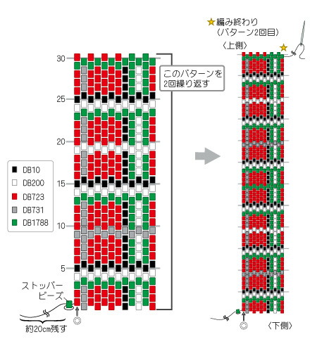 1 ビーズステッチ糸(K4570/#8)を約135cmに切り、糸端から約20cmの位置にストッパービーズを通し、ペヨーテステッチで下図のパターンを編む(◎編み始め)。 糸の残りが20cmくらいになったら一旦糸をそのままにしておく。 新たに約135cmに糸を切り、新たな糸の編み始めの糸始末をして続きを編み、編み終わりの糸をそのまま残しておく。 最初の糸の編み終わりの糸始末をする。